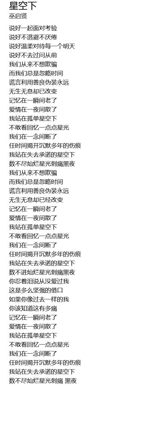 | [01:26.03] | 我站在失去承诺的星空下 |