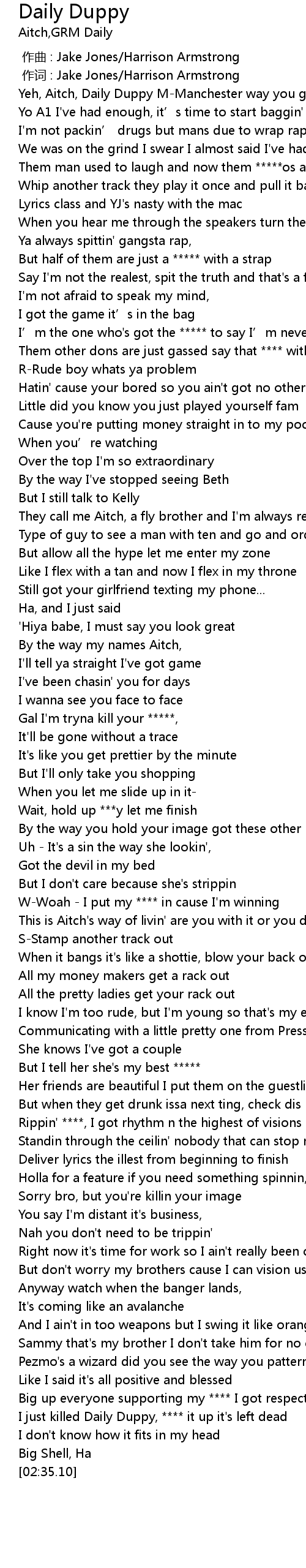 | [02:28.36] | I just killed Daily Duppy, **** it up it's left dead |