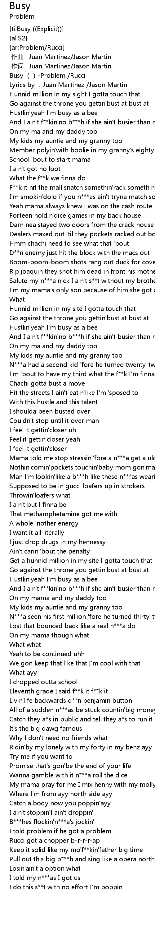 | [00:07.395] | And I ain' t f kin' no b h if she ain' t busier than me |