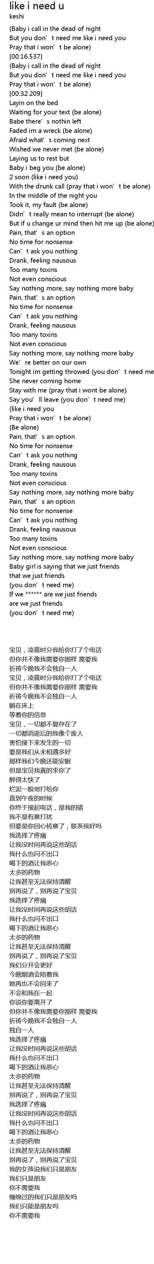 | [00:09.552] | But you don' t need me like i need you |