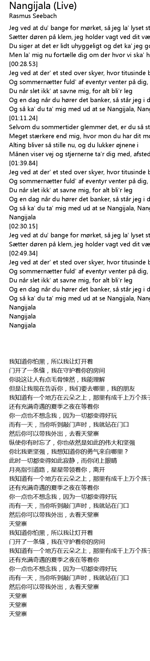 | [02:11.75] | Og s ka' du ta' mig med ud at se Nangijala, Nangijala |