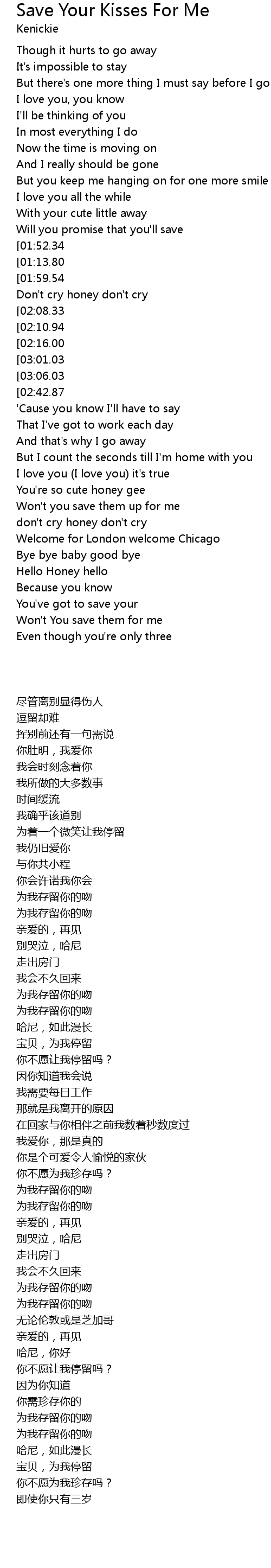 | [00:53.59][01:13.80][01:55.34][02:18.66][02:57.15] | Save all your kisses for me |