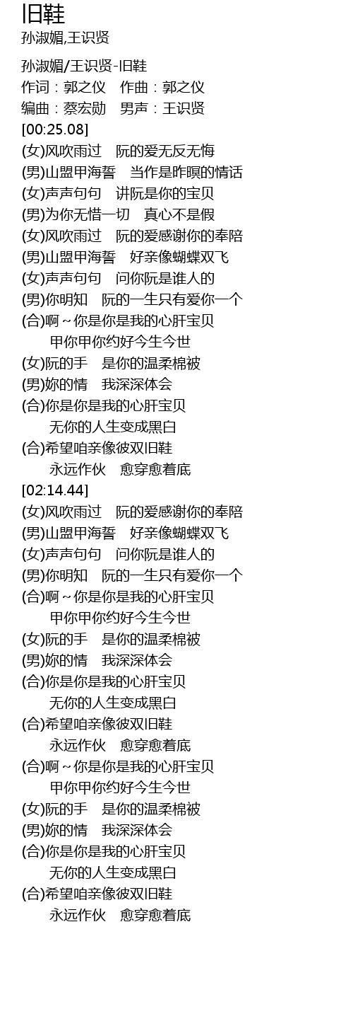 | [03:33.60] | (合)希望咱亲像彼双旧鞋 |
