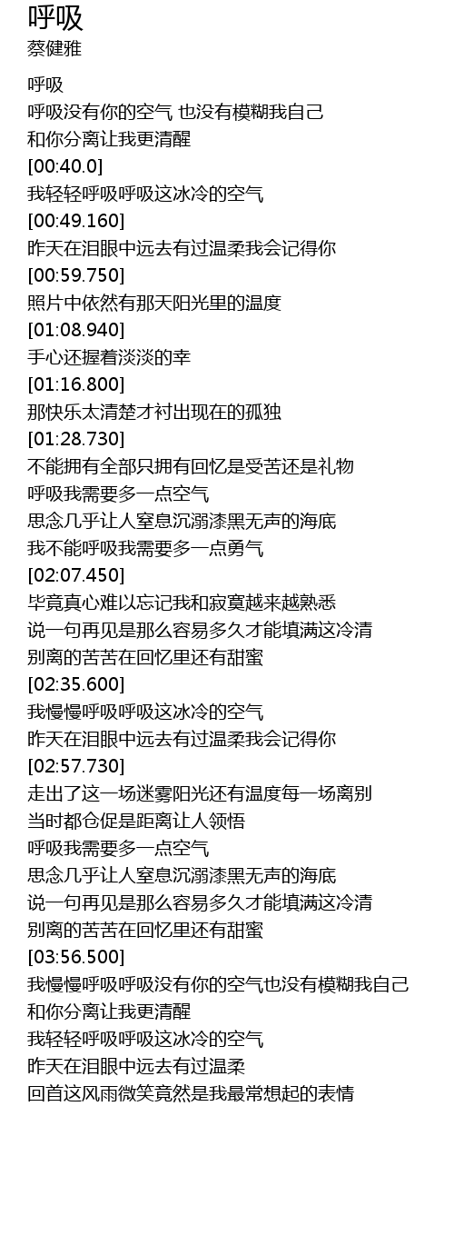 | [01:39.470] | 呼吸我需要多一点空气 |