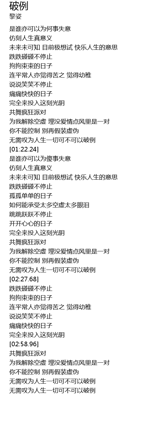 | [01:17.91] | wú xū tàn wéi rén shēng yī qiè kě bù kě yǐ pò lì |