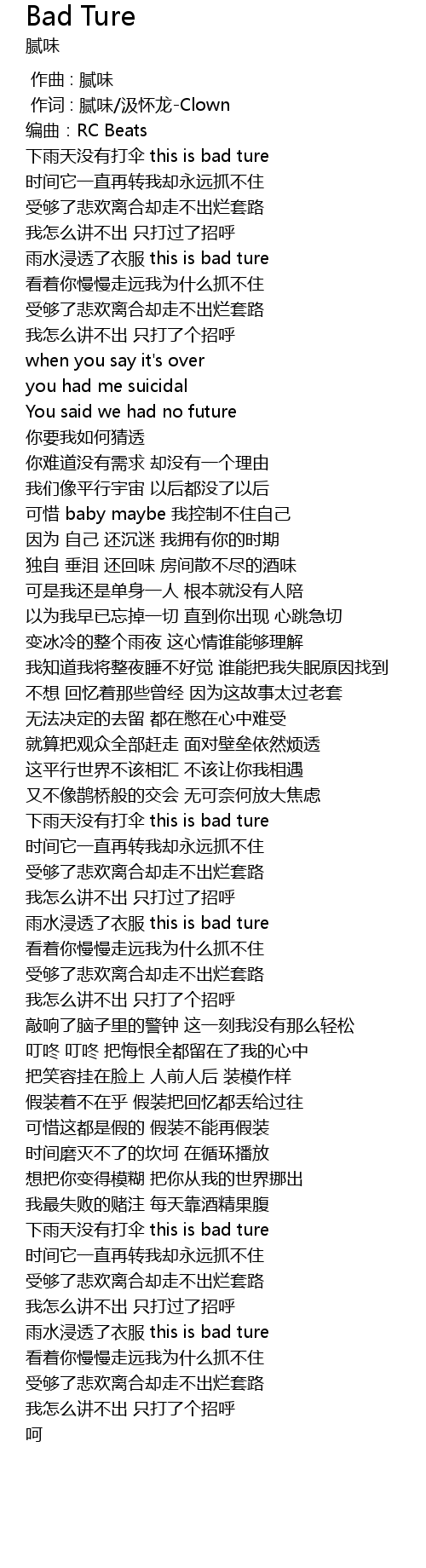 | [00:01.000] | 作词 : 腻味/汲怀龙-Clown |