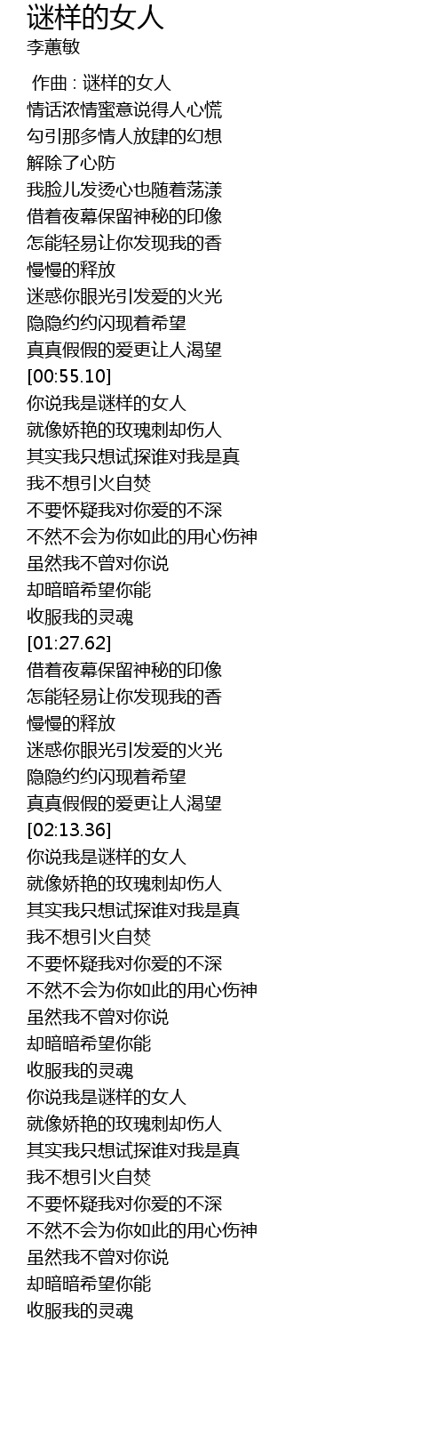 | [00:56.60] | 你说我是谜样的女人 |