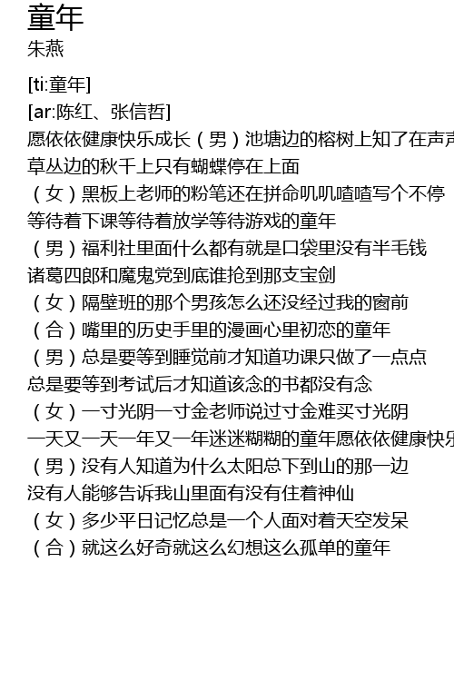 | [01:35.450] | 一天又一天一年又一年迷迷糊糊的童年愿依依健康快乐成长 |