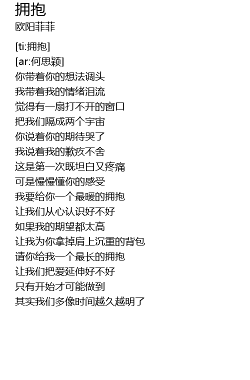 | [02:11.45] | 请你给我一个最长的拥抱 |