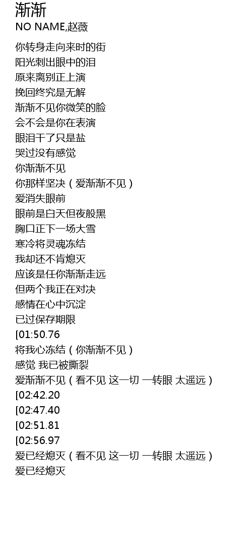 | [02:12.80][01:50.76] | 爱渐渐不见 |