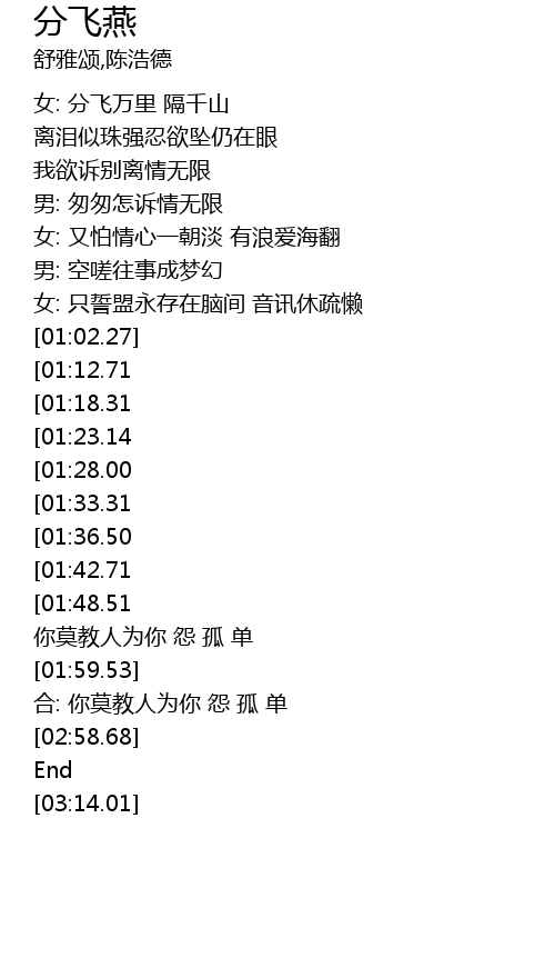 | [02:39.20][01:42.71] | 男: 心声托付鸿与雁 |
