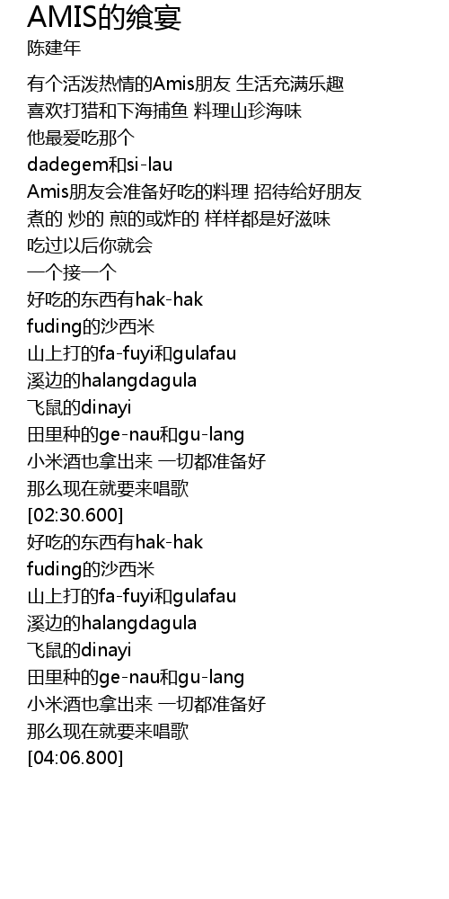 | [00:42.150] | yǒu gè huó pō rè qíng de Amis péng yǒu shēng huó chōng mǎn lè qù |
