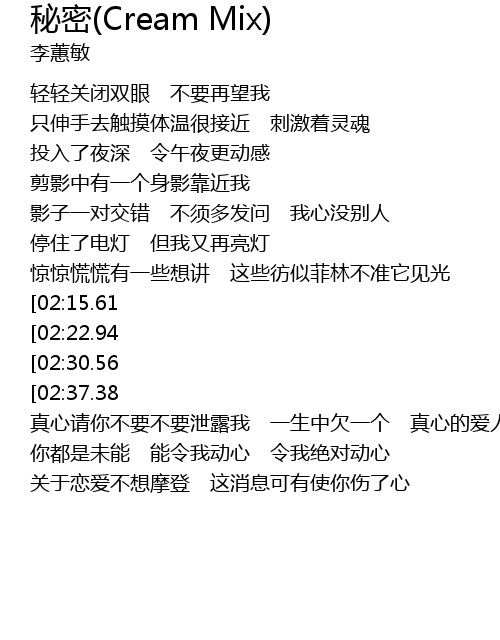 | [02:46.10][02:15.61][00:57.19] | 有个秘密秘密于心窝 从未从未谈论过 请相信我 |