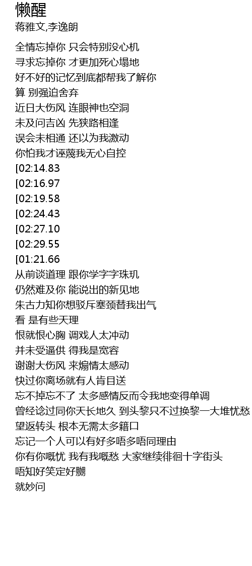 | [02:57.66][02:14.83][01:01.36] | 你话你是我亦痛别懒醒 |