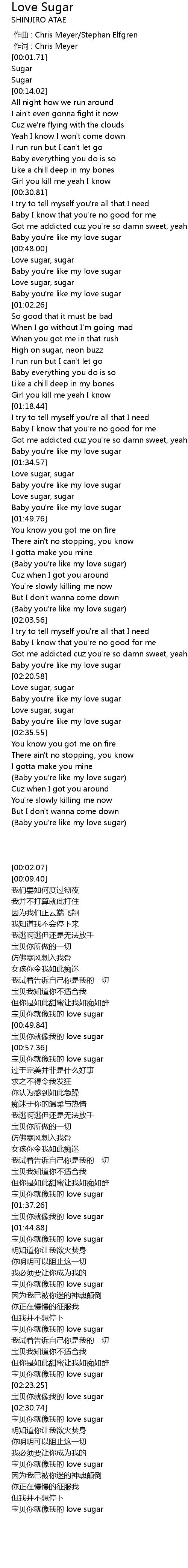 | [02:17.60] | Baby you're like my love sugar |
