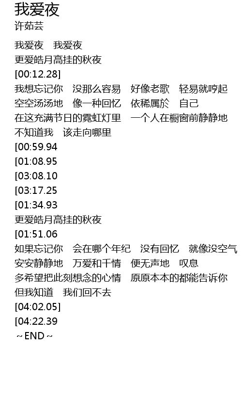 | [04:30.71][04:22.39][04:14.46] | 我爱夜 |
