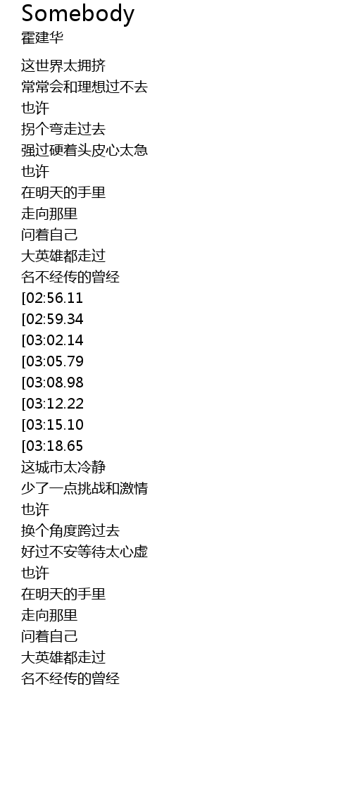 | [03:34.92][02:56.11][01:25.06] | wo yi ding hui cheng somebody |