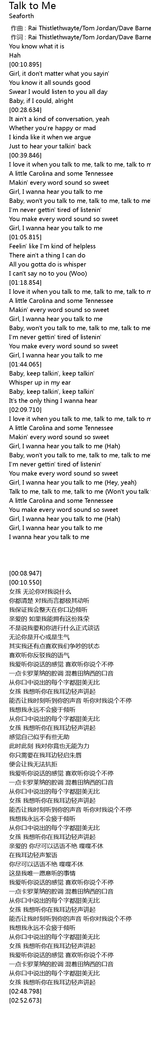 | [00:40.440] | I love it when you talk to me, talk to me, talk to me |