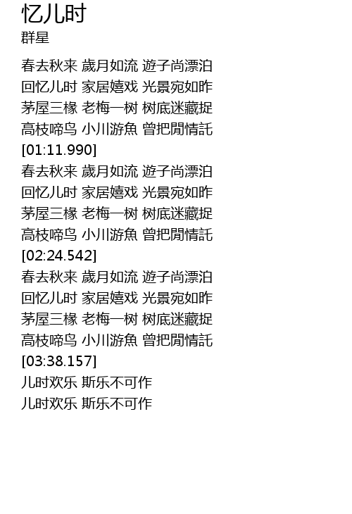 | [03:02.387] | 回忆儿时 家居嬉戏 光景宛如昨 |