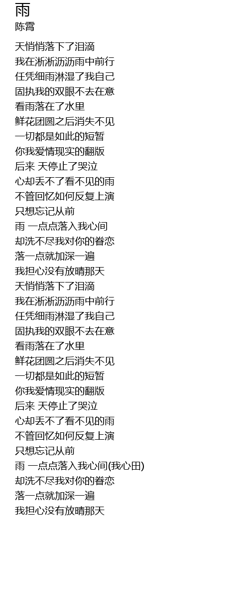 | [03:23.990] | 雨 一点点落入我心间(我心田) |