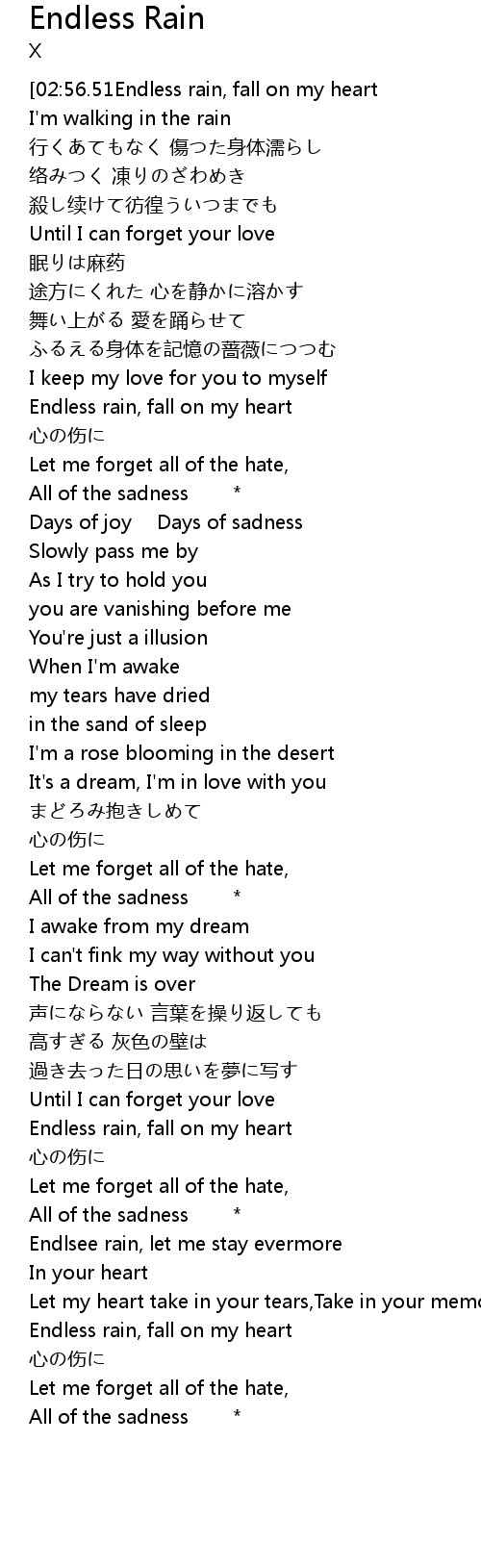 | [05:30.76] | Endlsee rain, let me stay evermore |