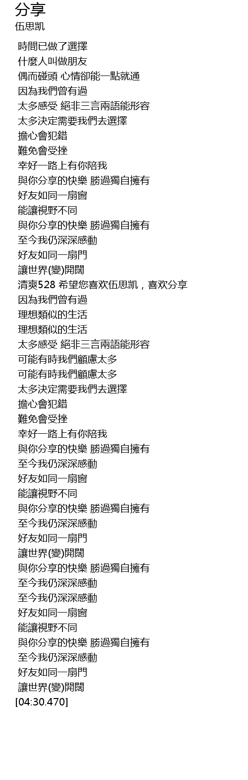 | [04:11.610] | 與你分享的快樂 勝過獨自擁有 |