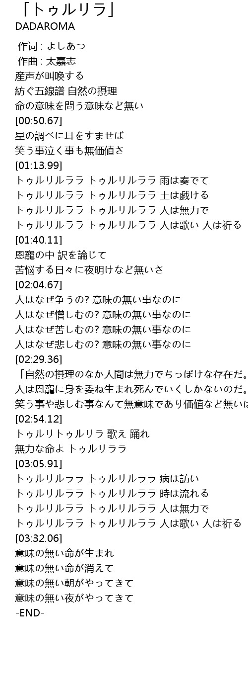 | [03:00.59] | 無力な命よ トゥルリララ |