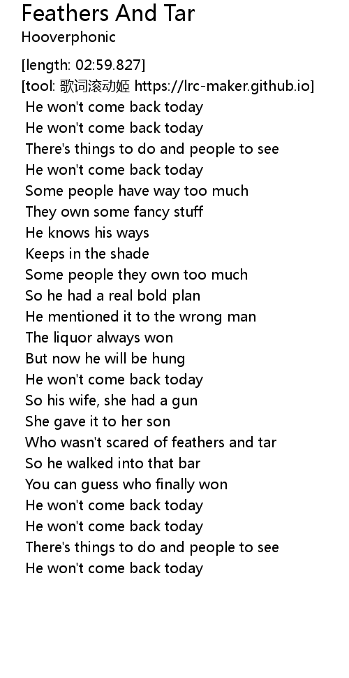 | [01:58.455] | Who wasn' t scared of feathers and tar |