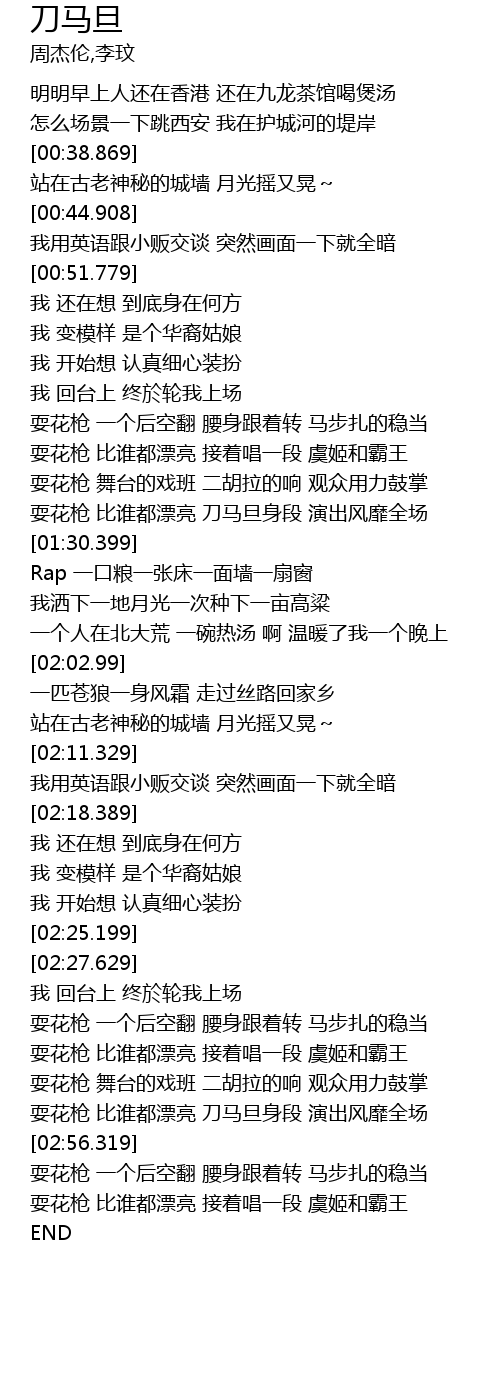 | [02:37.679] | 耍花枪 比谁都漂亮 接着唱一段 虞姬和霸王 |