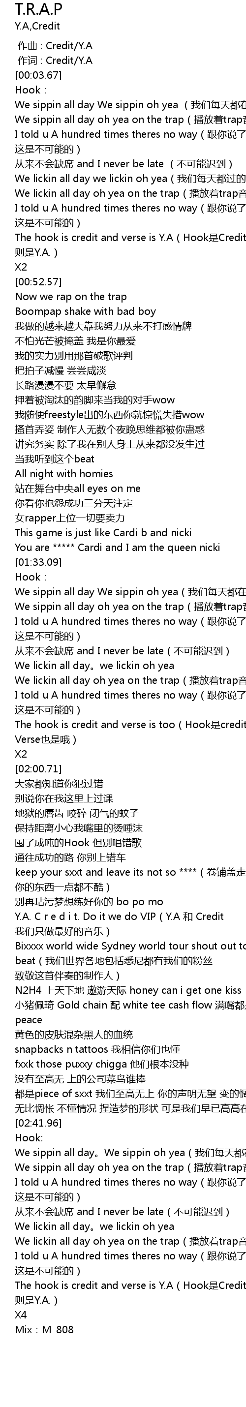 | [02:54.37] | The hook is credit and verse is Y.A(Hook是Credit 唱的 verse 则是Y.A.) |