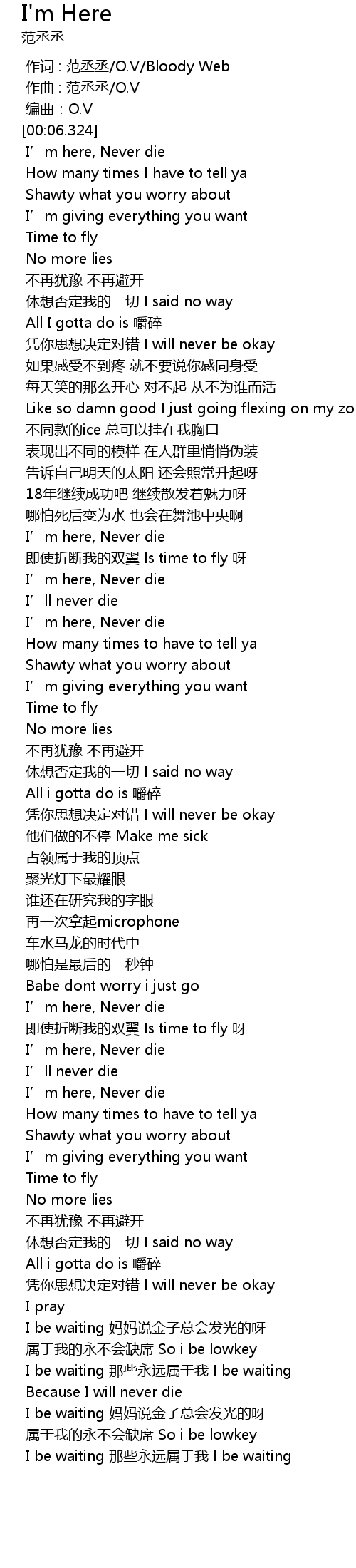 | [00:01.000] | 作词 : 范丞丞/O.V/Bloody Web |
