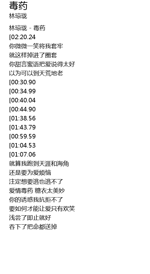 | [02:38.32][01:38.56][00:50.20] | 爱情是毒药 糖衣太美妙 |