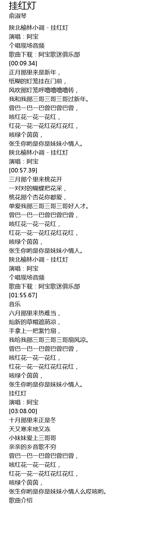 | [00:01.57] | 陕北榆林小调 - 挂红灯 |
