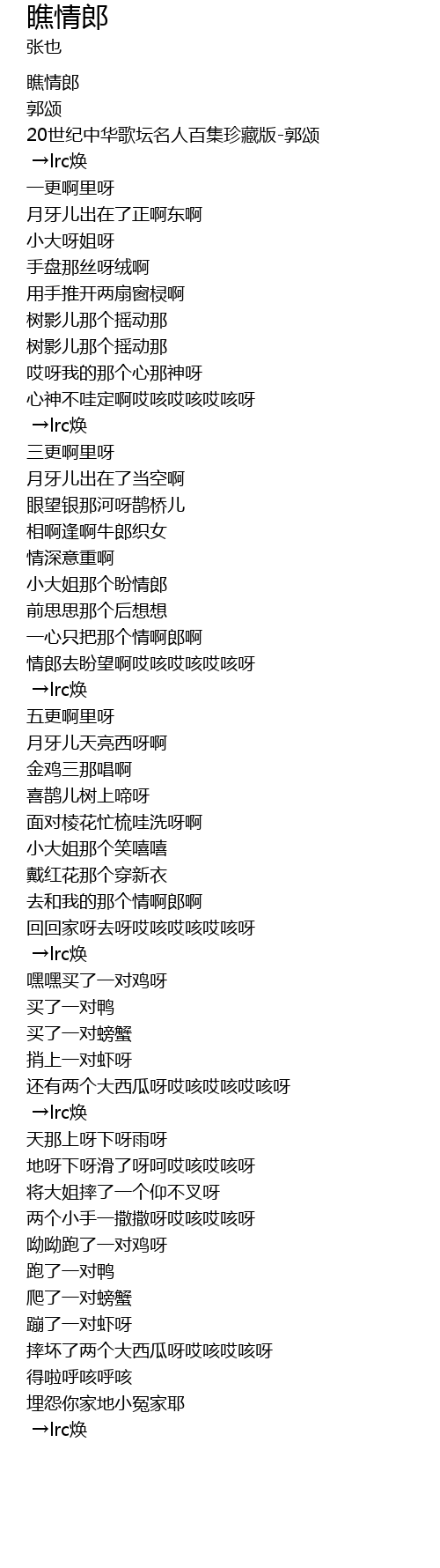 | [01:43.90] | 情郎去盼望啊哎咳哎咳哎咳呀 |