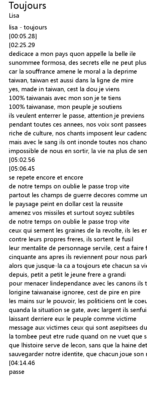 | [00:18.04] | sunommee formosa, des secrets elle ne peut plus tenir |