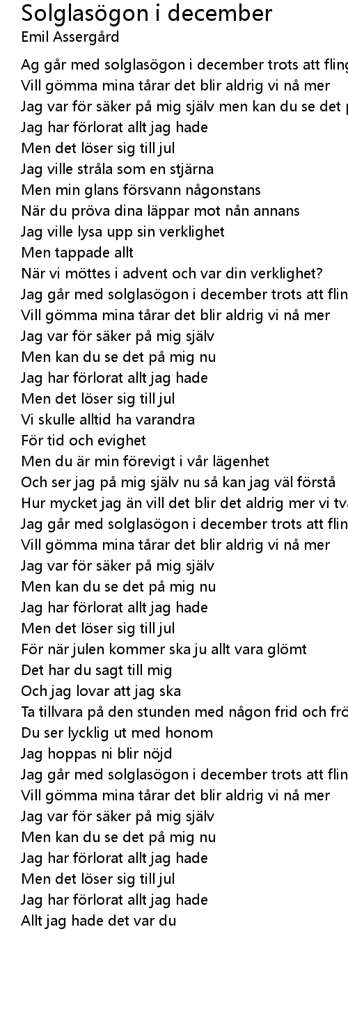 | [00:56.62] | Jag går med solglasögon i december trots att flingor faller ner |