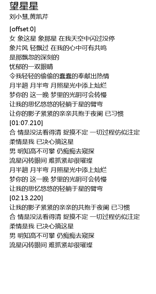| [00:11.400] | 女 象这星 象那星 在我天空中闪过没停 |
