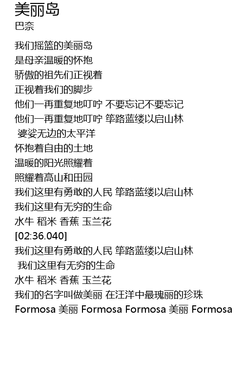 | [03:34.429] | Formosa mei li Formosa Formosa mei li Formosa |