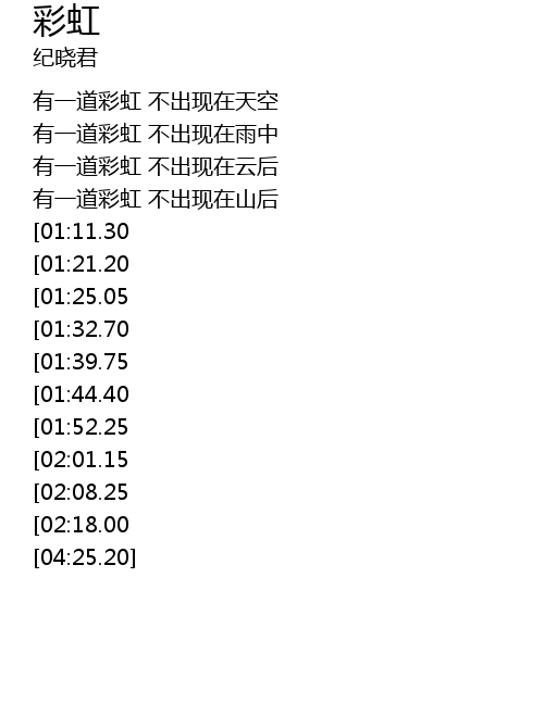 | [04:03.00][02:08.25] | 有一道彩虹 不出现在云后 |