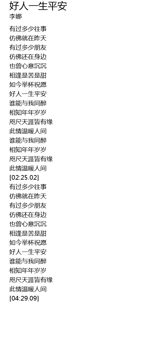 | [01:21.53] | hǎo rén yī shēng píng ān |