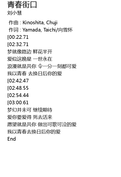 | [03:06.50][02:42.47][01:54.65][00:54.62] | cong qian qi dai qing chun jie kou yuan wang wei lai |
