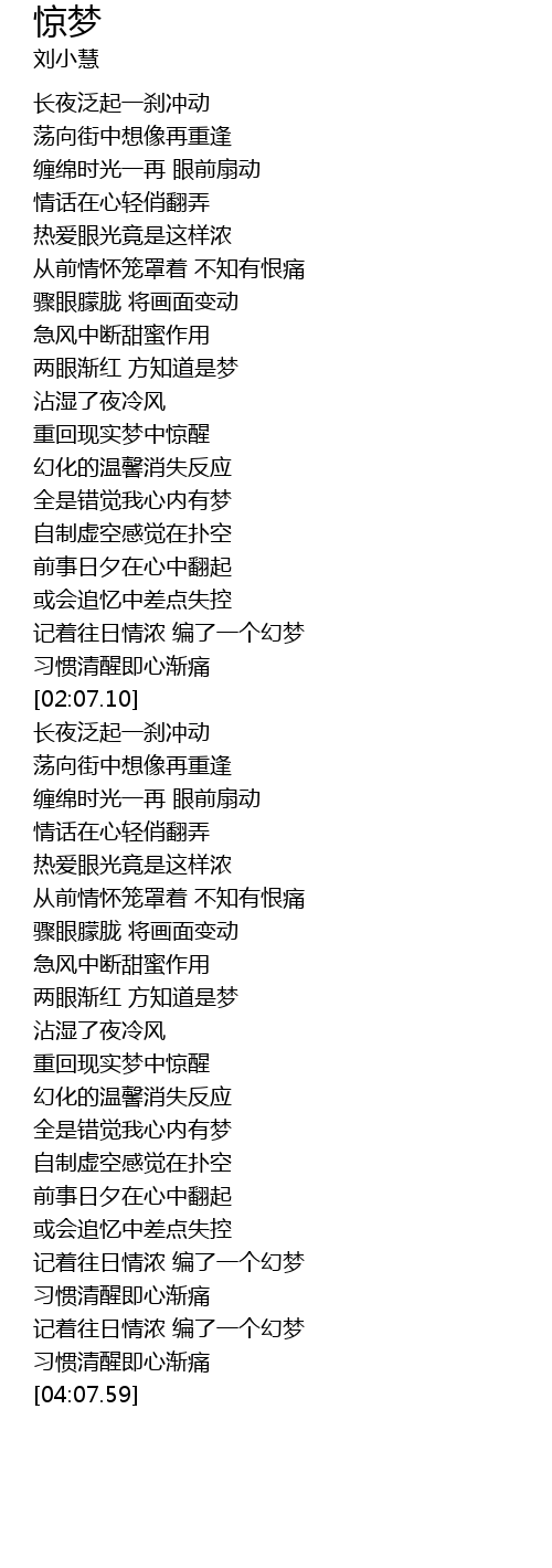 | [01:19.94] | 两眼渐红 方知道是梦 |