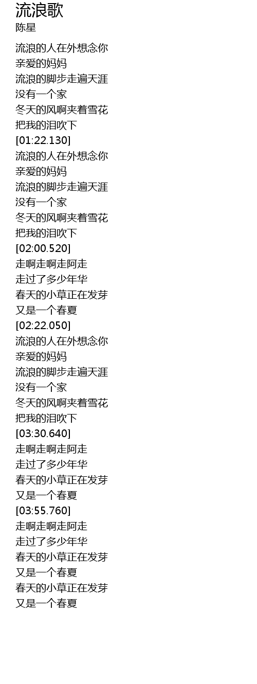 | [01:35.230] | 流浪的脚步走遍天涯 |
