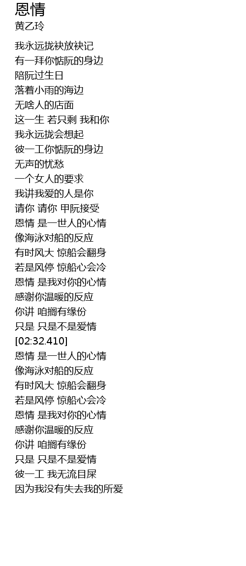 | [01:46.370] | ēn qíng shì wǒ duì nǐ de xīn qíng |