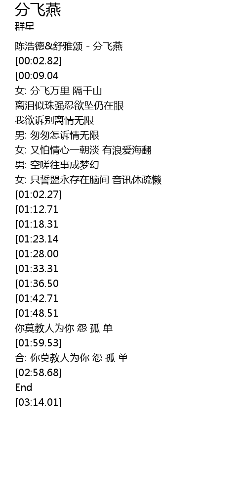 | [00:00.00] | 陈浩德&舒雅颂 - 分飞燕 |