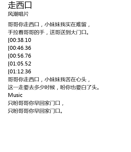 | [01:35.51] | 哥哥你走西口,小妹妹我苦在心头, |