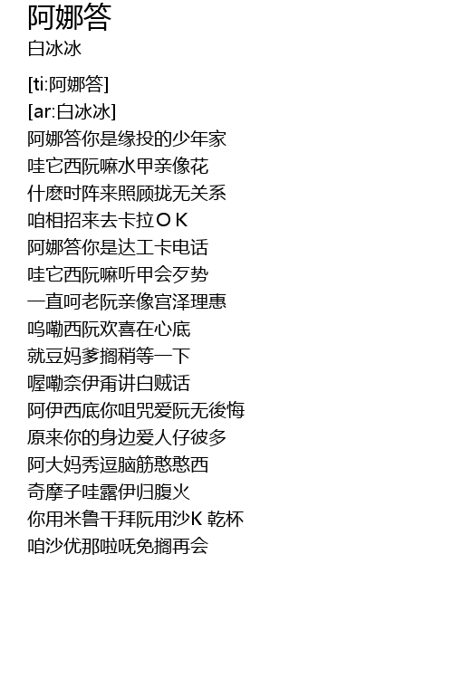 | [00:29.38] | 阿娜答你是缘投的少年家 |