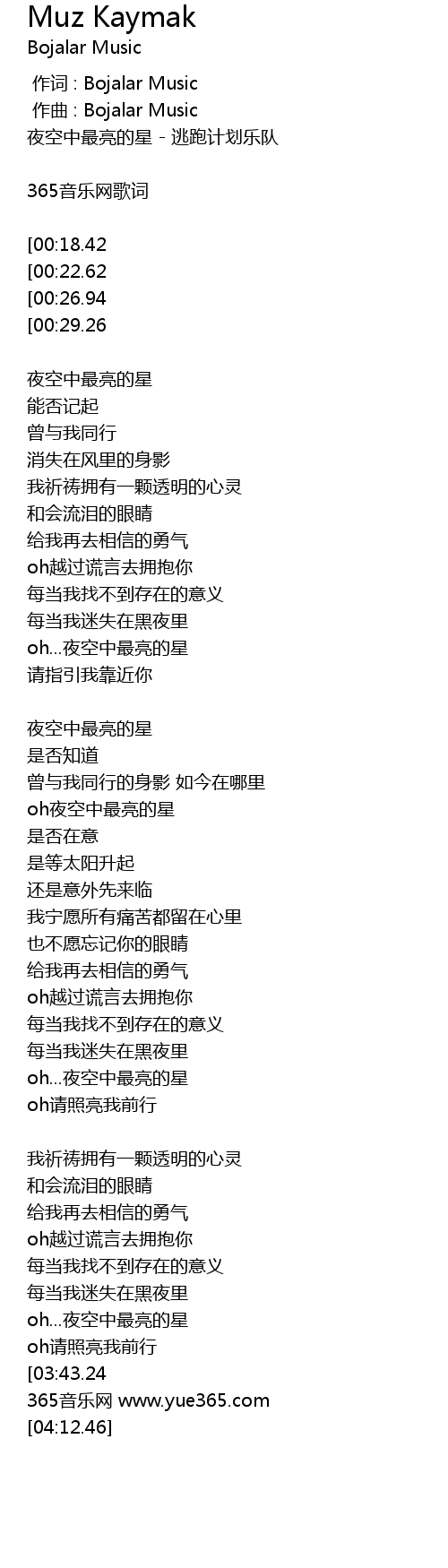 | [00:00.03] | 夜空中最亮的星 - 逃跑计划乐队 |