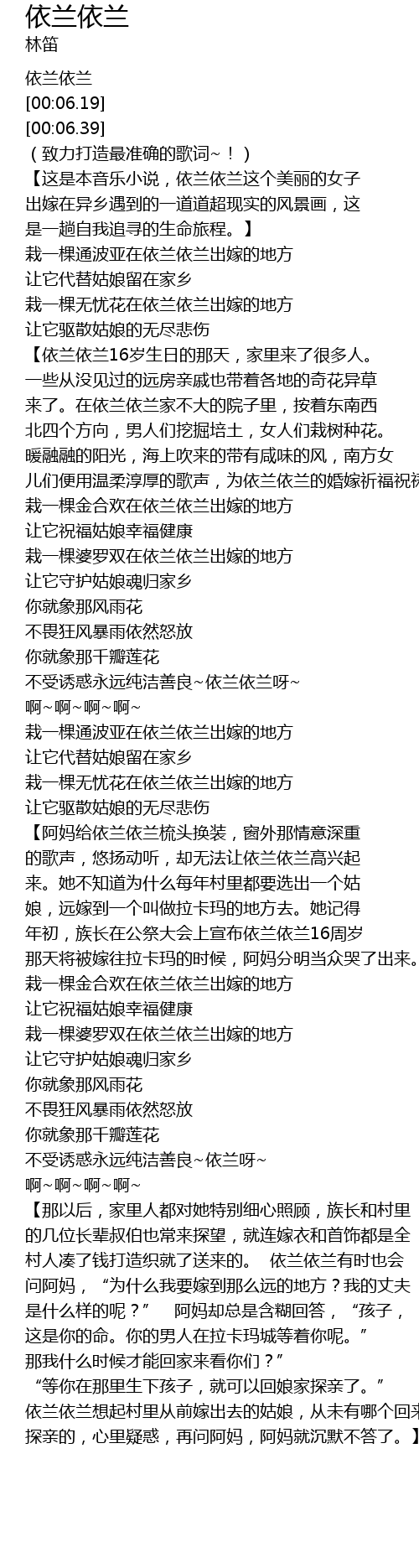 | [05:10.20] | 依兰依兰想起村里从前嫁出去的姑娘,从未有哪个回来 |