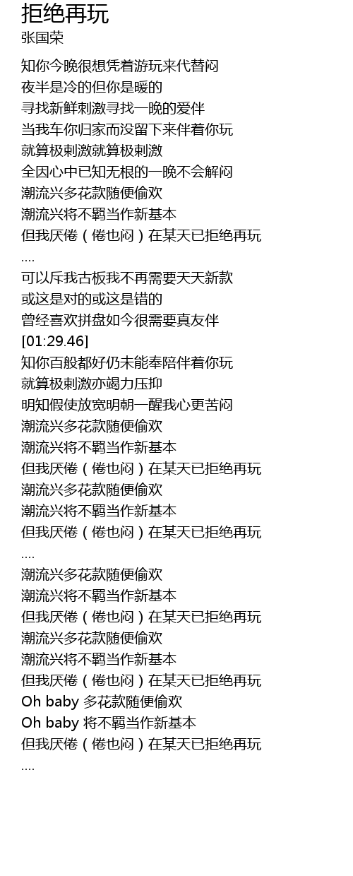 | [01:56.99] | 但我厌倦(倦也闷)在某天已拒绝再玩 |